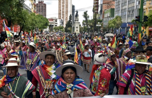 En la marcha, se ven telas de aguayo brillantes hechas con lana tradicional, y whipalas, las banderas multicolores de los nativos andinos que Evo Morales introdujo como símbolo nacional en 2009.