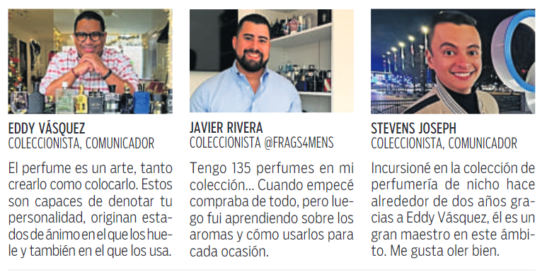 “Solo los disfruto y me los pongo según la ocasión. ¿Cuál es el más exótico que tengo?, uno que huele a esa madera marina que encuentras en la playa, sobre la arena”, contó Vásquez.