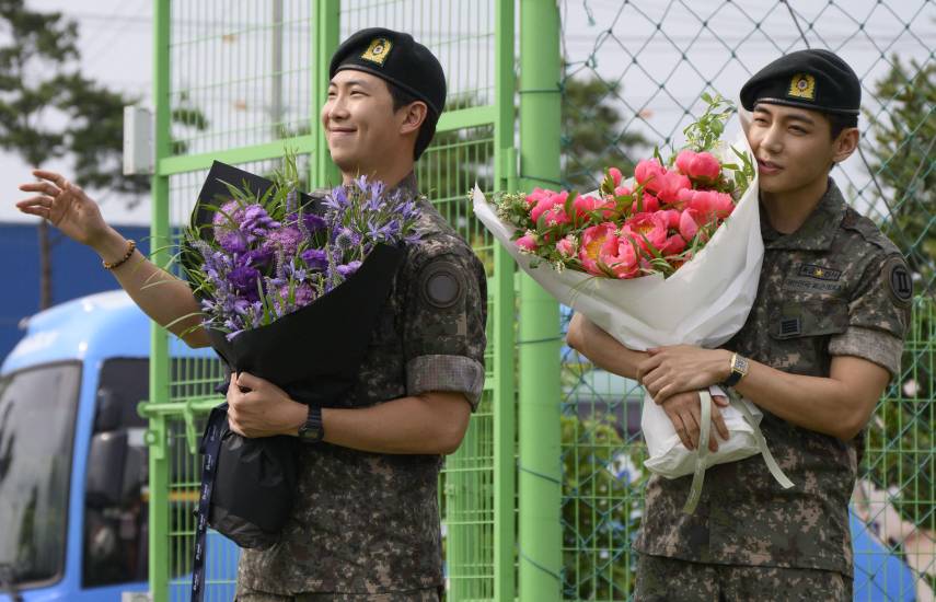 Centenares de seguidores se aglomeraron en dos bases del ejército en las afueras de Seúl donde RM, líder de la agrupación musical, y V fueron dados de baja.