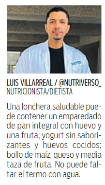 Una lonchera saludable puede contener un emparedado de pan integral con huevo y una fruta; yogurt sin saborizantes y huevos cocidos; bollo de maíz, queso y media taza de fruta. No puede faltar el termo con agua.