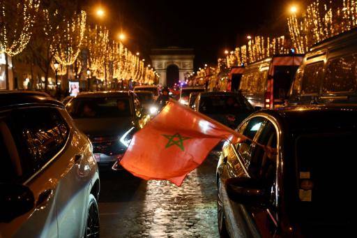 Cientos de aficionados marroquíes, todavía eufóricos por su histórica victoria, seguían recorriendo en coche o a pie la larga avenida parisina, agitando la bandera roja con la estrella verde de su país.
