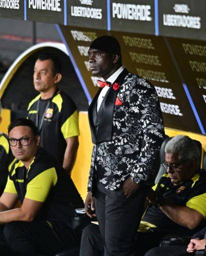 Las cámaras apuntaron al DT ecuatoriano cuando apareció en la cancha del Estadio Monumental Banco Pichincha luciendo una pajarita y un smoking blanco, que resaltaba su brillante piel negra.
