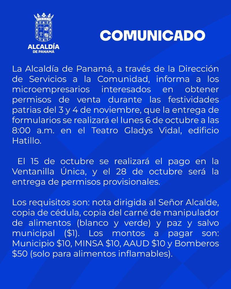 La Alcaldía de Panamá está convocando a los microempresarios interesados en obtener permisos de venta para participar en las Fiestas Patrias del 3 y 4 de noviembre.
