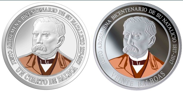 Una de las monedas es de colección por un valor de B/. 20.00, y la otra de circulación corriente de B/.0.25, ambas con la efigie del Dr. Arosemena en el anverso, con aplicaciones a color y el texto siguiente: Justo Arosemena Bicentenario de su Natalicio 1817-2017.