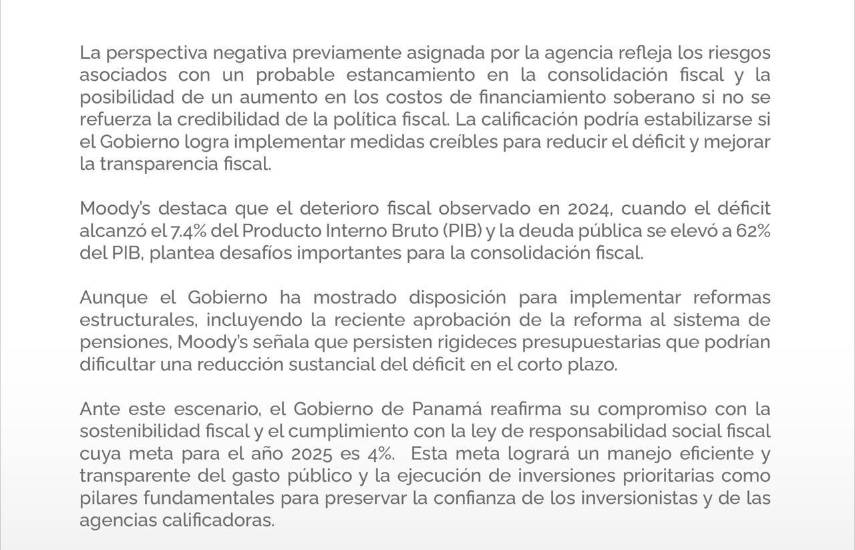 El Gobierno Nacional reafirmó su compromiso con la sostenibilidad fiscal y la transparencia en el manejo de las finanzas públicas, tras la advertencia emitida por la agencia calificadora Moody’s, que mantuvo la calificación de riesgo de Panamá, pero con perspectiva negativa.