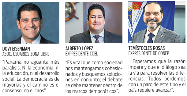 Temístocles Rosas, expresidente del Consejo Nacional de la Empresa Privada (CoNEP), indicó que “hago un llamado a la reflexión de quienes hoy están en paro y deploro las acciones que hoy afectan a los estudiantes y que ponen en riesgo los puestos de trabajo de muchos panameños”.