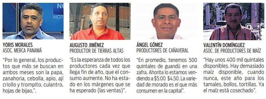Mientras que, Yoris Morales, presidente de la Asociación de Comerciantes de Merca Panamá, uno de los mercados más grandes, explicó: “creemos que la cebolla estará como en 0.80 o 0.90 centavos la libra, papa debe estar entre 0.60 y 0.65 centavos la libra, el bijao 0.75-$1.00 el rollo. El guandú se espera que el precio esté entre $1.75 -$2.00 la libra, remolacha calculamos entre 0.75 y la zanahoria 0.80 la libra. El maíz pilado 0.40 centavos la libra”. Aseguró que una piña pequeña, se puede conseguir a menos de 0.75 centavos y una grande a $1.00. El saril a $1.00.