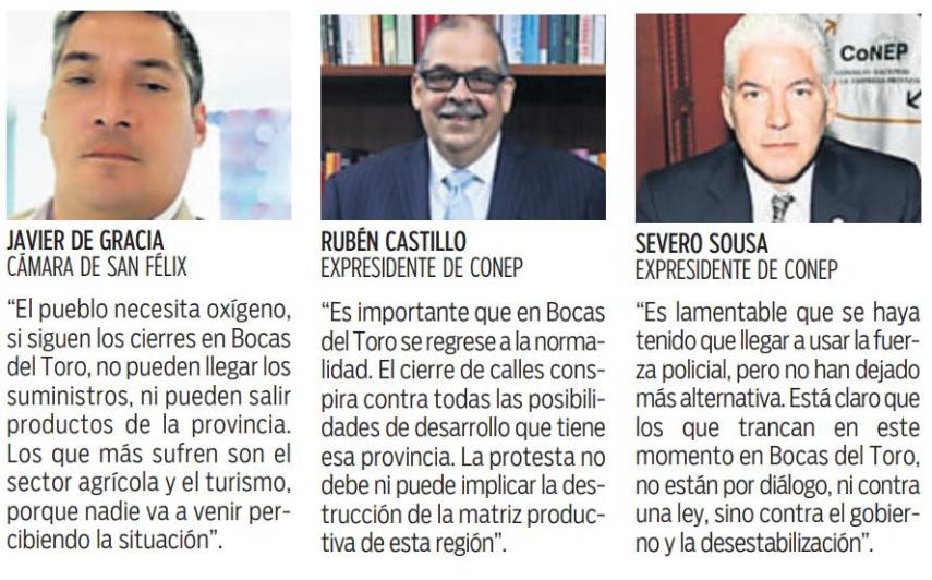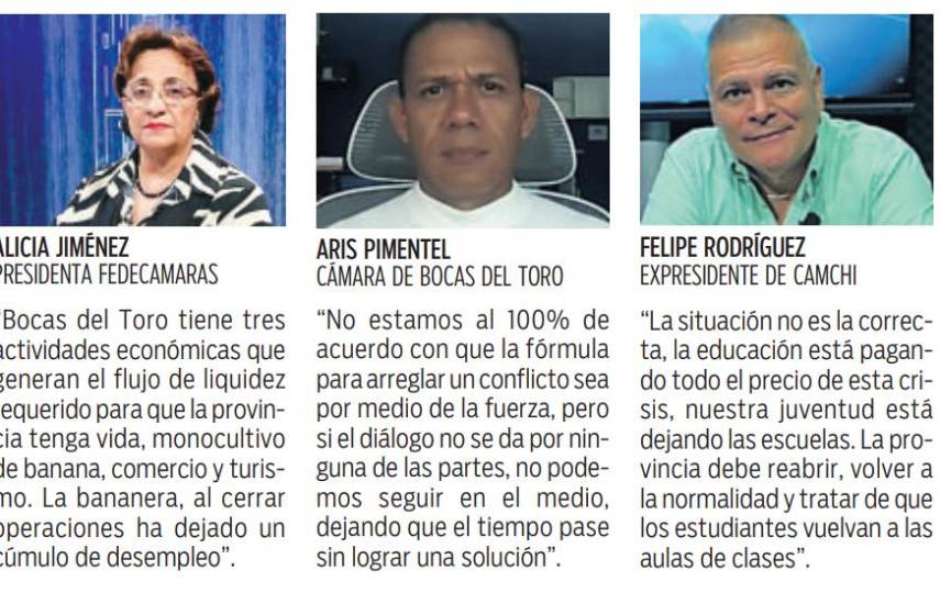 Alicia Jiménez, presidenta de la Federación de Cámaras de Comercio de Panamá, indicó que ya cerró la bananera y “manteniendo los cierres acabarán con las otras dos actividades que es el comercio y el turismo. Es imperante que abran las vías de lo contrario, tendremos una provincia fantasma”.