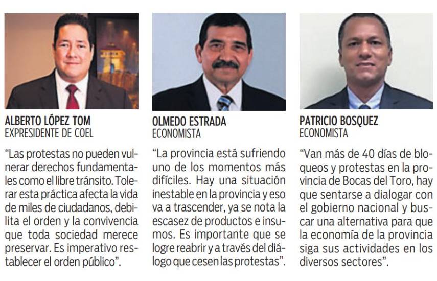 Empresarios, líderes locales y economistas manifestaron ayer que “urge” lograr la reapertura de todas las carreteras en la provincia de Bocas del Toro, ya que los cierres, que llevan más de 40 días, han provocado el cierre de empresas, pérdida de empleos, escasez de productos y graves afectaciones a la economía local.