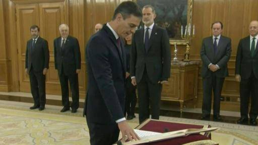Al jurar su cargo el viernes ante el Rey Felipe VI en el Palacio de la Zarzuela, Pedro Sánchez prometió, ante el rey Felipe VI, "cumplir fielmente con las obligaciones del cargo de presidente del Gobierno" y "guardar y hacer guardar la Constitución", durante una ceremonia en el palacio de la Zarzuela de Madrid, residencia de familia real española.