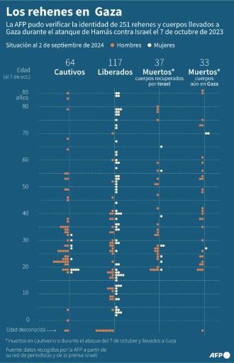 Hasta el 2 de septiembre de los 251 rehenes y cuerpos trasladados a Gaza el 7 de octubre de 2023, 117 fueron liberados --principalmente mujeres, niños y trabajadores extranjeros--, 64 siguen retenidos y se cree que están vivos, y 70 murieron; los cuerpos de 37 de ellos fueron repatriados y 33 siguen en Gaza.