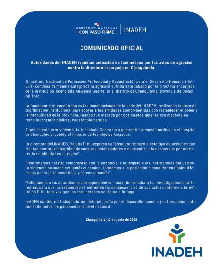 El Instituto Nacional de Formación Profesional y Capacitación para el Desarrollo Humano (INADEH) condenó la agresión sufrida por la directora encargada de la institución, licenciada Anayansi Guerra, en el distrito de Changuinola, provincia de Bocas del Toro.