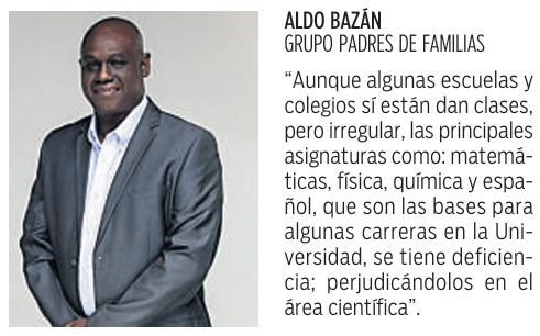 Por otro lado, Zuleika Fonseca, expresidenta de la Asociación de Padres de Familia de la Escuela República de Venezuela, mencionó que “a pesar de que en el colegio actual donde están mis hijos se están dando clases, existe deficiencia, ya que por la cantidad mínima de estudiantes que asisten, los profesores optan por reunirlos a todos en un salón”.