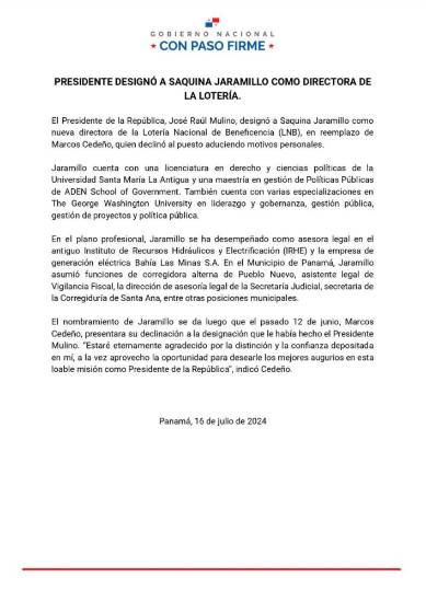 El presidente José Raúl Mulino designó a Saquina Jaramillo como nueva directora de la Lotería Nacional de Beneficencia (LNB), en reemplazo de Marcos Cedeño, quien declinó al puesto aduciendo motivos personales.
