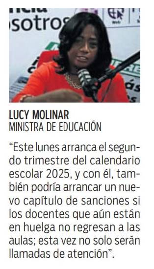 Cordura, conciencia y sentido de responsabilidad es lo que pide la ministra de Educación, Lucy Molinar, tras el inicio del segundo trimestre el próximo 23 de junio, para no poner en riesgo el año lectivo 2025; mientras, los docentes logran un primer acercamiento con el Órgano Ejecutivo