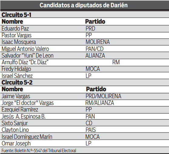 La provincia de Darién tiene dos circuitos electorales (5-1 y 5-2) y en cada uno debe salir electo un diputado