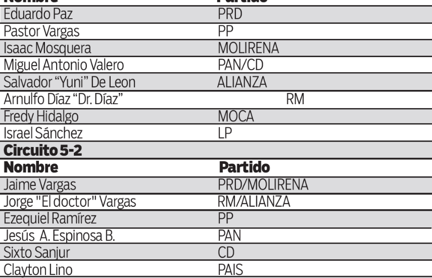 Para el circuito 5-2, que comprenden los distritos de Pinogana y Cémaco, estarán corriendo para diputados Jaime Vargas, quien busca la reelección con el respaldo de la alianza de partidos PRD y Molirena; Jorge “El Doctor” Vargas, en la casilla de RM y Alianza; Ezequiel Ramírez del PP; Jesús A. Espinosa B., del Panameñismo; Sixto Sanjur por el CD; Clayton Lino, del Partido Alternativa Independiente Social (PAIS) e Israel Domínguez Marín, quien irá por MOCA. La casilla por la libre postulación la logró Omar Joseph.