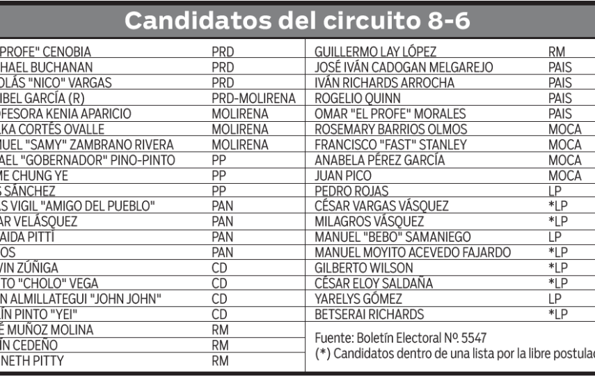 La papeleta del circuito 8-6 que representa a los corregimientos de La 24 de Diciembre, Las Garzas, Mañanitas, Pacora, Pedregal, San Martín y Tocumen tendrá a 39 candidatos que buscarán los votos para ocupar las cuatro curules que deben salir electas.