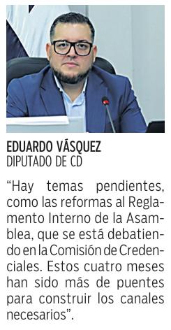 Por su lado, José Pérez Barboni, del Movimiento Otro Camino (MOCA), dijo: “Creo que estos primeros meses fueron de reconocimiento para la nueva administración de la Asamblea, pero ahora tenemos que ver materializado, por ejemplo, el tema de las oficinas. Todos los diputados deben tener los mismos espacios en la Asamblea”. “Esperamos que el reglamento interno llegue al debate. Se está fiscalizando más el tema de los viáticos, eso demuestra un compromiso con la austeridad”, destacó Pérez Barboni.