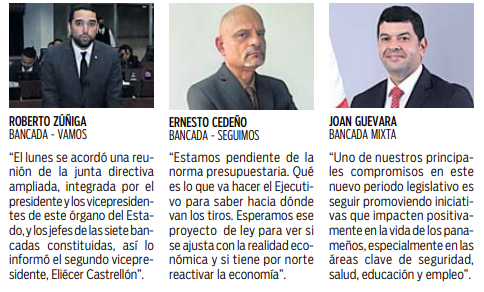 En el caso del partido Panameñista, el diputado Medin Jiménez, coordinador de la bancada, manifestó que acordaron reunirse este martes “para establecer la hoja de ruta en cuanto a los temas que presentará en este periodo de la Asamblea”.